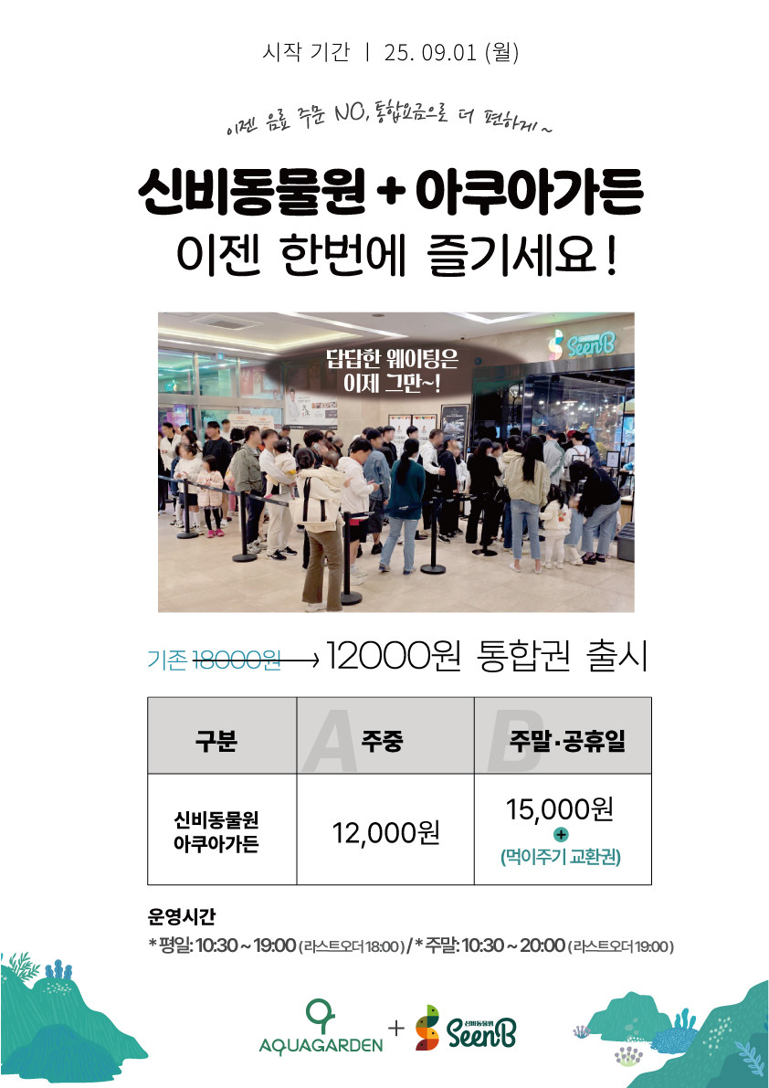 | 평일 통합권 | 신비동물원 + 아쿠아가든카페 (음료 주문 필수 아님) | 12,000원 | 입장권 |