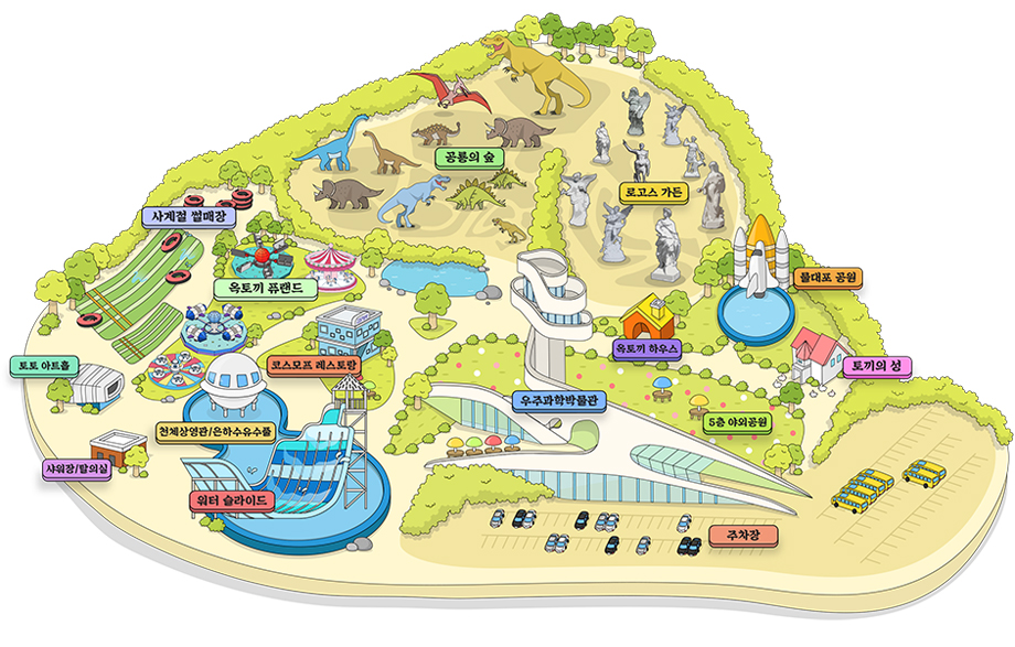 - 유모차: 실내전시관 및 야외공원에서 유모차 사용 가능(유모차는 안내데스크에서 대여 가능)