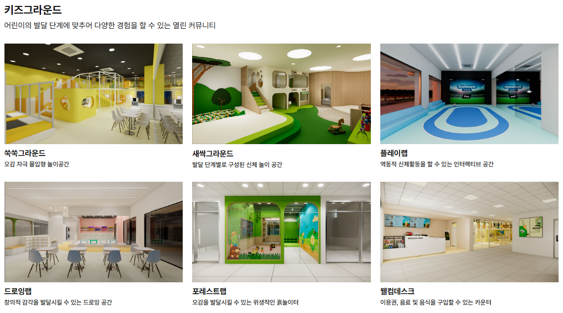 새싹 그라운드 / 쑥쑥 그라운드 / 플레이랩 오감놀이 / 드로잉랩 미술놀이 / 포레스트랩 흙놀이 / 카페