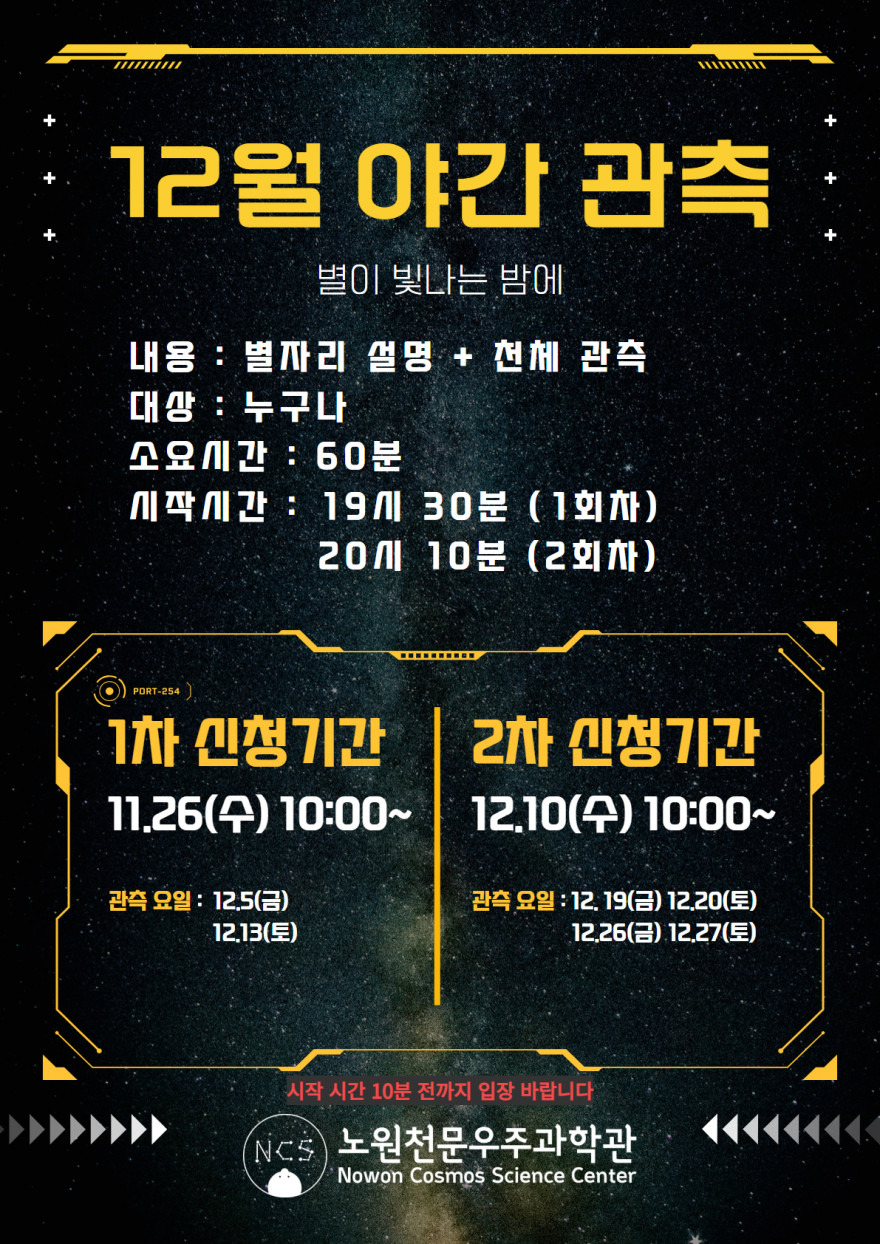✅ 야간 프로그램 참여 시 가벼운 외투를 챙기세요 (천문대가 개방형이라 바람이 불어요)