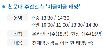 매일 낮 시간에 천체망원경으로 태양의 흑점과 홍염을 관측하는 프로그램이에요. 태양 관측은 사전 예약 50% + 현장 선착순 50%으로 이곳에서 예약 후 참여 가능하답니다 ☀️ 대상은 모든 연령층으로 성인 2,000원, 6세 이상 1,000원의 비용이 발생해요.
