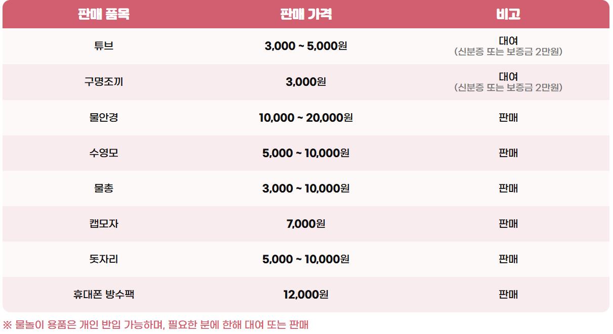 타인에게 불편을 줄 수 있는 형태 및 크기의 물놀이 용품은 불가하니 참고해주세요!