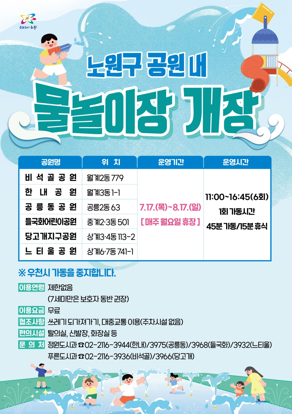 노원구에서는 매년 여름철 주민들의 무더위를 식히기 위해 노원 공원 물놀이장을 운영하는데요, 2025년 올해는 6개소를 무료로 운영한다고 해요. 2025년에는 7월 17일부터 8월 17일까지 약 한 달간 운영(매주 월요일 휴장)되며, 비석골공원, 한내공원, 공릉동공원, 들국화어린이공원, 당고개지구공원, 느티울공원 등에서 만날 수 있답니다. 지난해까지 운영하던 에어바운스 물놀이장들이 올해는 여러 여건들로 인해 미운영된다고 해요 🥺