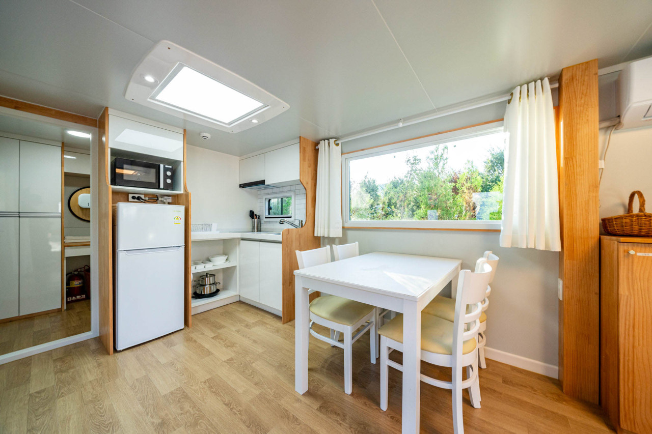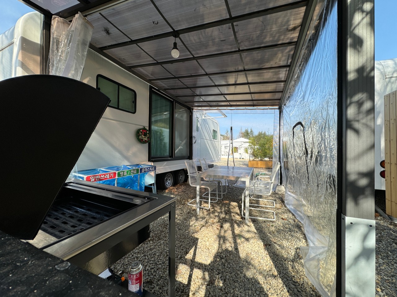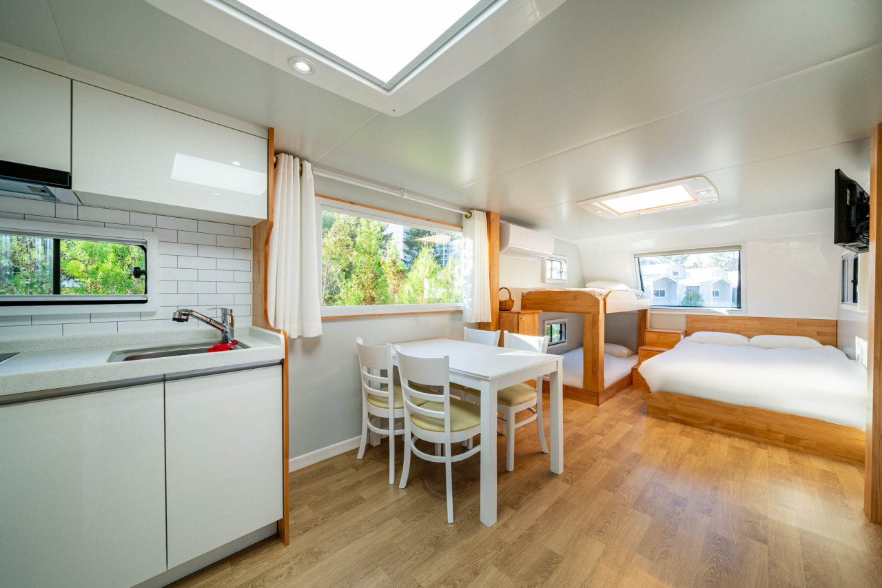 - 대형 카라반: 더블침대, 2층침대, 4인 테이블, 주방, 화장실, 에어컨, 온돌난방, 와이파이, TV 등 완비. 가족 단위에 최적.
