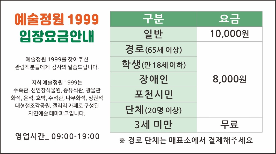 포천 예술정원1999 자연예술테마파크는 방문객의 연령 및 조건에 따라 다양한 입장료가 적용됩니다. 관람 전 요금 정보를 미리 확인하고 방문 계획을 세우는 것이 중요해요.
